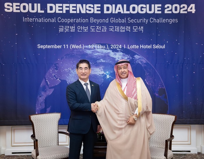 South Korean Defense Minister Kim Yong-hyun (L) poses with Khaled bin Hussein Al-Biyari, Saudi assistant minister of defense for executive affairs, prior to their talks in Seoul on Sept. 12, 2024, on the sidelines of the Seoul Defense Dialogue 2024, in this photo provided by the defense ministry. (PHOTO NOT FOR SALE) (Yonhap)