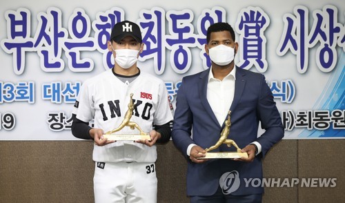| ▲ 최동원상 수상자들 (서울=연합뉴스) 김도훈 기자 = 19일 오후 서울 강남구 야구회관에서 열린 제7회 부산은행 최동원상 및 제3회 대선고교 최동원상 시상식에서 두산 베어스의 라울 알칸타라와 인천고 윤태현이 트로피를 들고 기념촬영을 하고 있다. 2020.11.19 superdoo82@yna.co.kr |