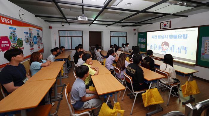 Elementary school students learn how to act in case of an earthquake at the safety experience center of the Incheon Education Administration in Incheon, 27 kilometers west of Seoul, on June 13, 2024, following a 4.8 magnitude quake that struck the country's southwestern county of Buan the previous day. It was the strongest on the Korean Peninsula so far this year. (Yonhap)