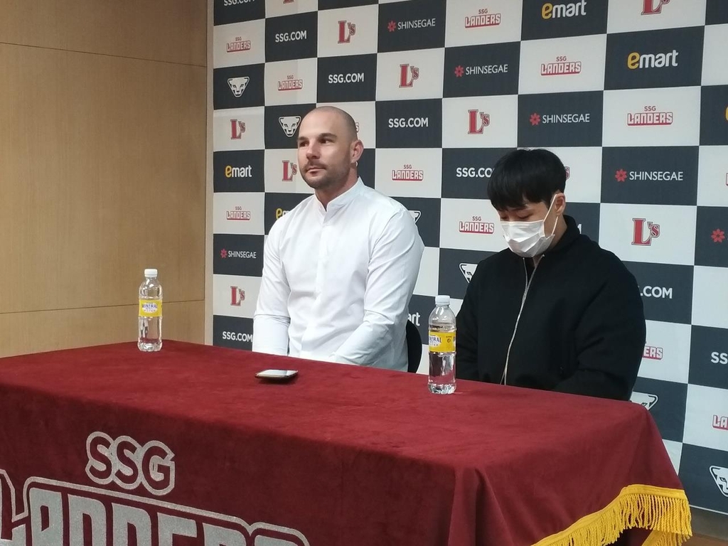 | ▲ Jamie Romak of the SSG Landers (L) holds his retirement press conference at Incheon SSG Landers Field in Incheon, 40 kilometers west of Seoul, on Nov. 3, 2021. (Yonhap) |