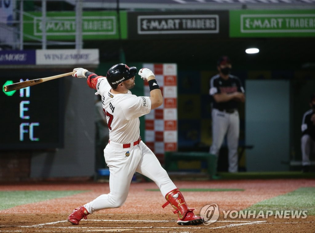 | ▲ In this file photo from Sept. 8, 2021, Jamie Romak of the SSG Landers hits a two-run home run against the LG Twins in the bottom of the sixth inning of a Korea Baseball Organization regular season game at Incheon SSG Landers Field in Incheon, 40 kilometers west of Seoul. (Yonhap) |