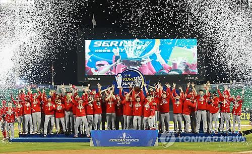 | ▲ This file photo from Nov. 12, 2018, shows members of the SK Wyverns celebrating their Korean Series title at Jamsil Baseball Stadium in Seoul. (Yonhap) |