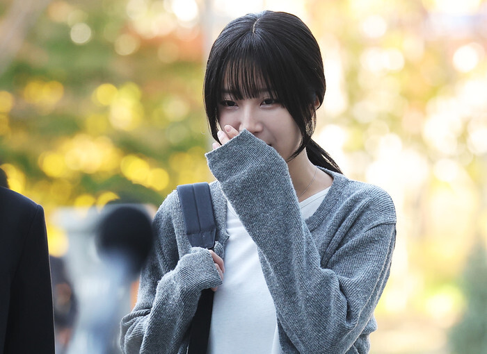 South Korean online 'mukbang' star Tzuyang responds to reporters' questions as she arrives at Suwon District Court in Suwon, south of Seoul in Nov. 15, 2024, to attend a hearing as a witness in the case of alleged blackmail and extortion against her by Lee Jun-hee, known for his YouTube channel, Gujeyeok. (Yonhap)