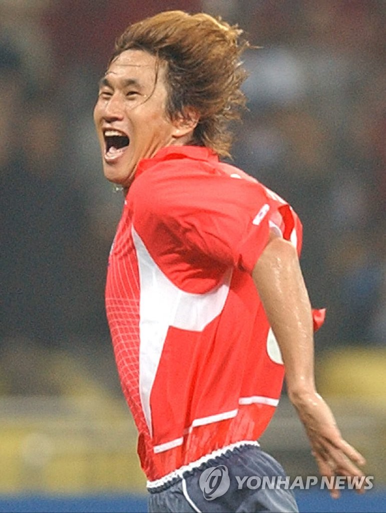 | ▲ In this file photo from June 4, 2002, Yoo Sang-chul of South Korea celebrates his goal against Poland in the teams' Group D match at the 2002 FIFA World Cup at Busan Asiad Main Stadium in Busan, 450 kilometers southeast of Seoul. (Yonhap) |