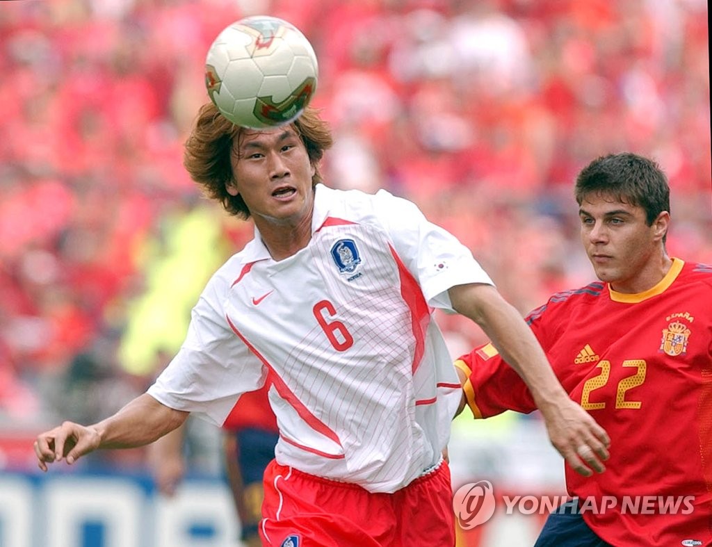 | ▲ In this file photo from June 22, 2002, Yoo Sang-chul of South Korea (L) heads the ball against Spain in the quarterfinals of the 2002 FIFA World Cup at Gwangju World Cup Stadium in Gwangju, 330 kilometers south of Seoul. (Yonhap) |