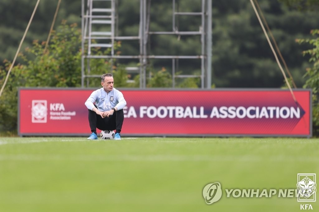 | ▲ Paulo Bento, head coach of the South Korean men's national football team, watches his players during practice at the National Football Center in Paju, Gyeonggi Province, on June 7, 2021, in this photo provided by the Korea Football Association. (PHOTO NOT FOR SALE) (Yonhap) |
