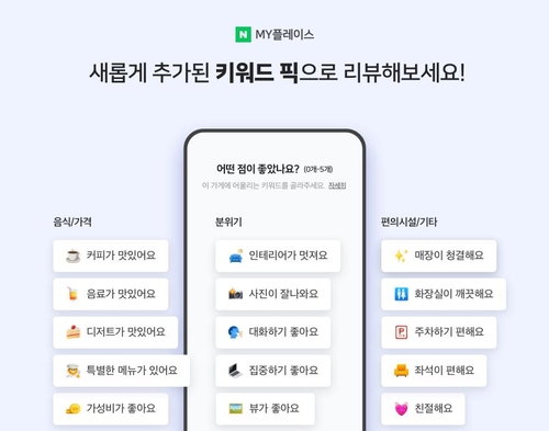 네이버는 고객이 방문한 가게의 장점을 선정해 후기를 남기는 '키워드 리뷰' 기능을 전날부터 식당·카페 업종을 대상으로 시범 적용하고 있다고 9일 밝혔다.