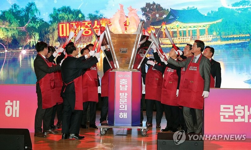 | ▲ "2025∼2026년은 충남 방문의 해" (홍성=연합뉴스) 18일 충남도청 문예회관에서 열린 '2025∼2026 충남 방문의 해' 범도민 다짐대회 및 서포터즈 발대식에서 김태흠 충남지사와 시군 단체장들이 앞치마를 두르고 성화를 밝히는 퍼포먼스를 하고 있다. 2024.12.18 [충남도 제공. 재판매 및 DB 금지] soyun@yna.co.kr |