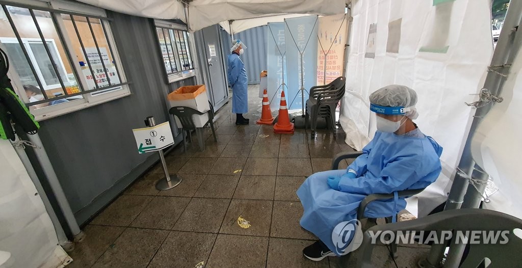 | ▲ Medical workers stand by at a quiet COVID-19 testing booth in Seoul's central district of Jongno, in this photo taken May 18, 2022, amid a decline in the infection numbers. (Yonhap) |