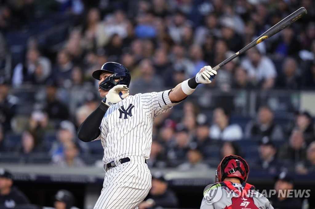 | ▲ 저지, 오타니 앞에서 시즌 6호 홈런 (뉴욕 AP=연합뉴스) 뉴욕 양키스 거포 저지가 20일(한국시간) 미국 뉴욕 양키스타디움에서 열린 메이저리그 로스앤젤레스 에인절스와의 홈 경기, 1회말에 투런 홈런을 치고 있다. |