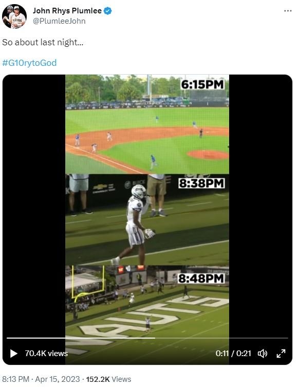 플럼리가 직접 트위터에 올린 영상에 따르면, 야구 경기에서 3루타를 친 시간은 오후 6시 14분이었고, 첫 번째 터치다운 패스에 성공한 건 오후 8시 38분이다.