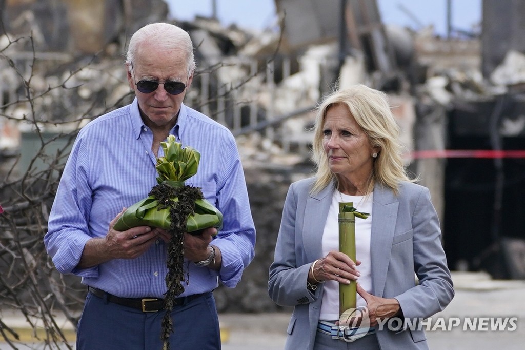 | ▲ 하와이 산불 피해지역서 축복 기원하는 바이든 부부 (라하이나 AP=연합뉴스) 조 바이든 미국 대통령(왼쪽)과 아내 질 바이든 여사가 21일(현지시간) 하와이 마우이섬 라하이나의 산불 피해 지역을 방문해 축복을 기원하고 있다. 산불 발생 13일 만인 이날 대통령 부부는 피해 상황을 둘러보고 사망자와 실종자 가족을 위로했다. 2023.08.22 ddy04002@yna.co.kr |