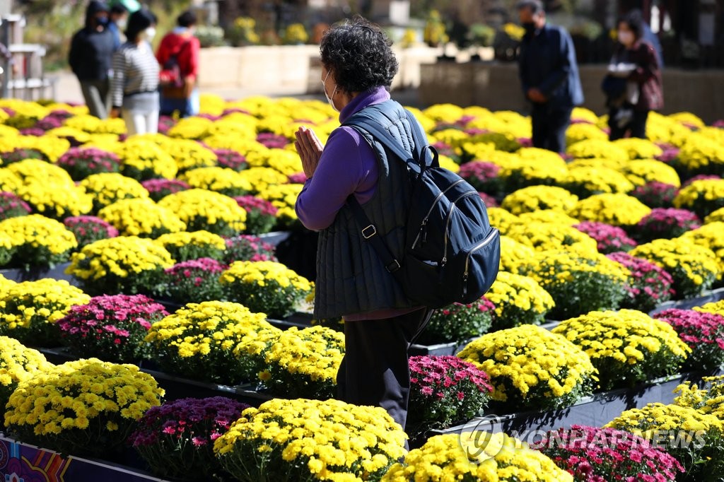 | ▲ '바람을 담아' (대구=연합뉴스) 김현태 기자 = 2023학년도 대학수학능력시험을 한 달여 앞둔 16일 대구 동구 팔공총림 동화사 대웅전 앞에 마련된 승시 국화축제 법계도 체험장에서 수험생 학부모 등 불자들이 저마다의 바람을 담아 합장을 하고 법계도를 걷고 있다. 2022.10.16 mtkht@yna.co.kr |