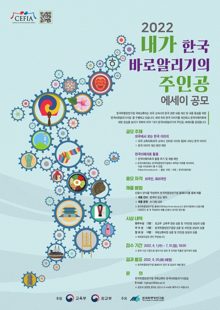 에세이 주제는 '외국에서 보는 한국 이미지'와 '한국이해자료 활용'이다. 최우수상 수상자 2명에게는 100만원 상당의 상품을 준다. 심사 결과는 9월 20일께 발표된다.