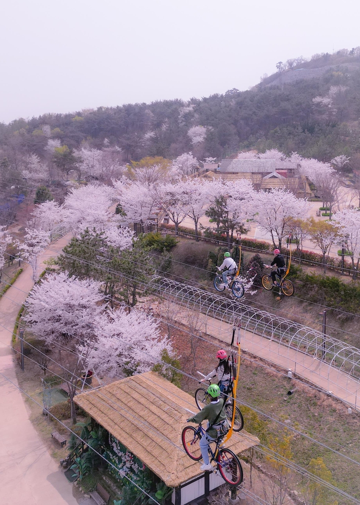 하늘에 매달린 채 페달을 밟고 앞으로 나가다 보면 활짝 핀 벚꽃 궁궐 위를 나는 듯한 착각이 든다.