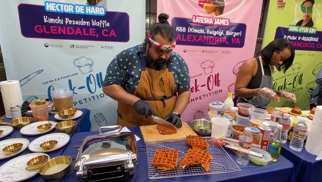 | ▲ 김치 와플을 요리하는 미국의 한식 애호가 헥터 더하로 씨 (로스앤젤레스=연합뉴스) 정윤섭 특파원 = 29일(현지시간) 한국농수산식품유통공사 LA 지사가 주최한 K푸드 요리대회에서 한식애호가 헥터 더하로 씨가 김치 와플을 만들고 있다. 2022.09.30 jamin74@yna.co.kr |