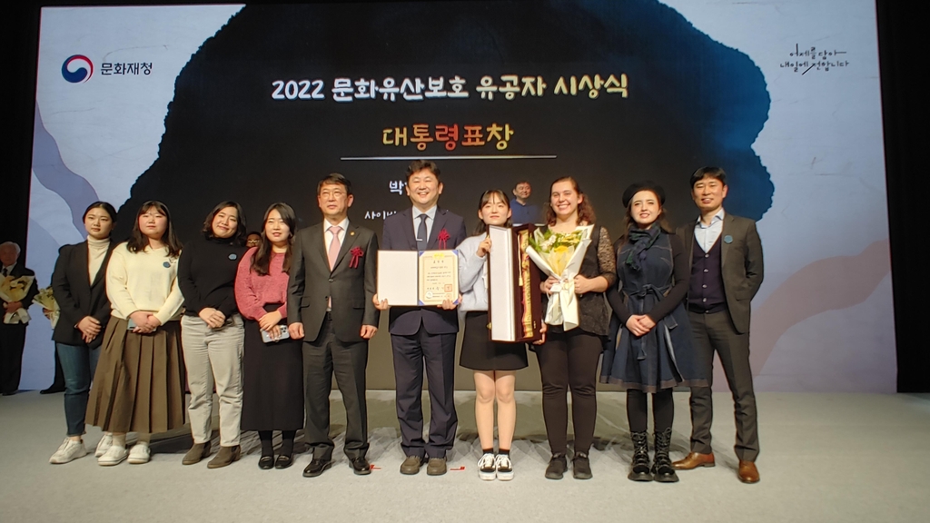▲ 사이버 외교사절단 반크는 8일 서울 강남구 역삼동에 있는 민속극장 풍류에서 문화재청이 주는 '2022 문화유산 보호 유공자 포상' 대통령 표창을 받았다. 반크는 100여 종류 150만부 이상의 한국 역사, 문화유산 홍보 자료를 제작해 사이버 외교관, 글로벌 한국홍보대사를 통해 전 세계에 배포하는 등 문화유산의 보존·연구·활용 분야에서 공적을 세워 수상의 영예를 안았다. (서울=연합뉴스)