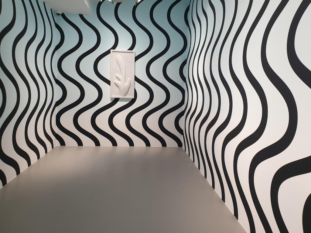 전시할 때마다 장소 특정적(site-specific) 작업을 하는 작가는 이번 전시에서 지하 1층과 지상 1층의 전시 공간 벽 전체를 구불거리는 나선형 패턴과 파란색으로 칠하는 벽화 작업으로 채워 마치 바닷속에 들어와 있는 듯한 느낌을 연출했다.