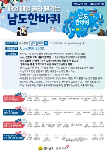 남도 한바퀴 겨울코스 상품예약은 누리집(http://citytour.jeonnam.go.kr)을 통해 할 수 있다.