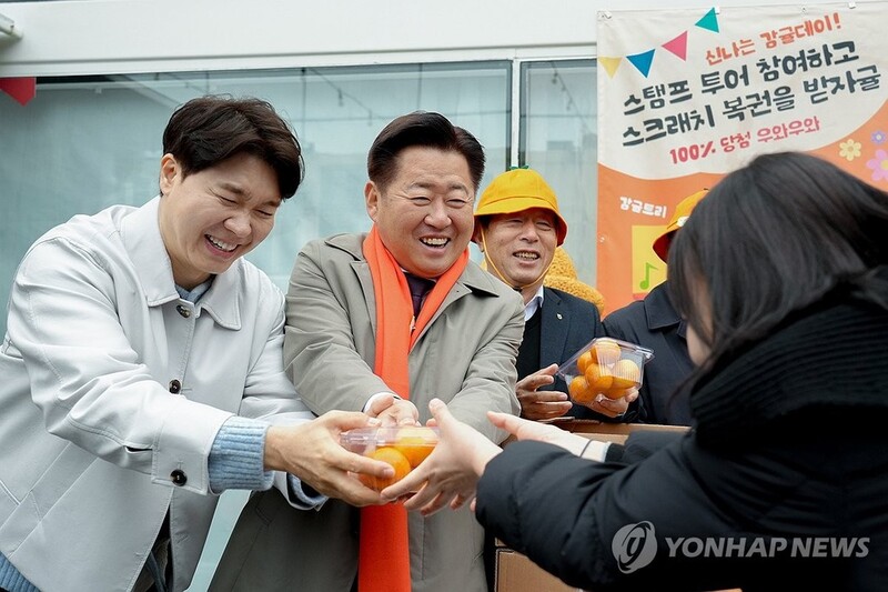 | ▲ "제주 감귤 많이 드세요" (제주=연합뉴스) 30일 서울 성수동 언더스탠드에비뉴에서 열린 '2024년 감귤데이 기념행사'에서 오영훈(사진 가운데) 제주지사와 제주도 홍보대사 박수홍씨가 제주감귤을 나눠주며 감귤을 홍보하고 있다. 감귤데이 행사는 12월 1일까지 진행된다. 2024.11.30 [제주도 제공, 재판매 및 DB 금지] bjc@yna.co.kr |