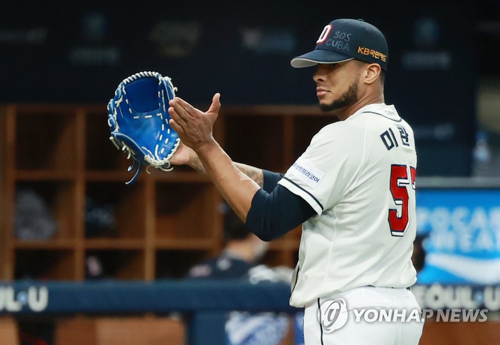 | ▲ In this file photo from Nov. 17, 2021, Ariel Miranda of the Doosan Bears celebrates the end of the top of the first inning against the KT Wiz in Game 1 of the Korean Series at Gocheok Sky Dome in Seoul. (Yonhap) |