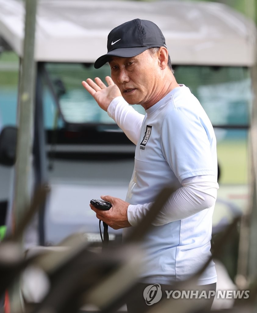 | ▲ Kim Hak-bum, head coach of the South Korean men's Olympic football team, addresses his players during practice at the National Football Center in Paju, Gyeonggi Province, on July 6, 2021. (Yonhap) |