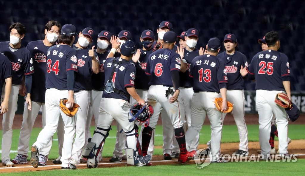 | ▲  Lotte Giants' players celebrate their 5-2 win over the NC Dinos in their Korea Baseball Organization regular season game at Changwon NC Park in Changwon, 400 kilometers southeast of Seoul, on Aug. 10, 2021. (Yonhap) |