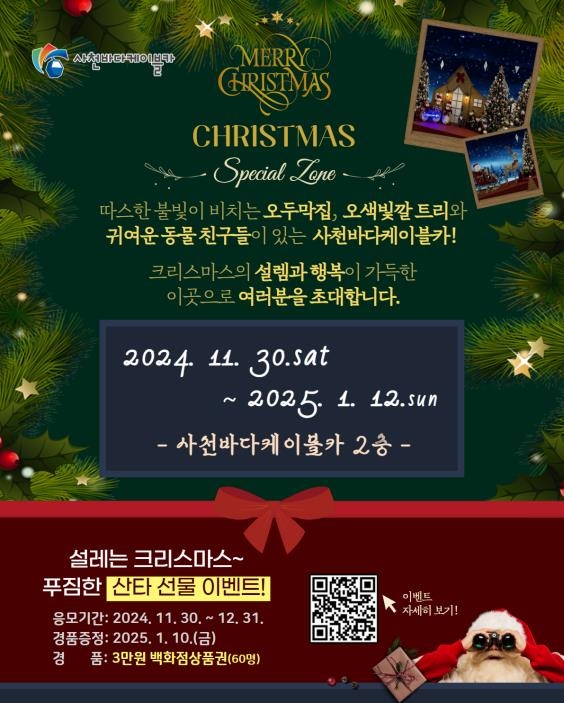 28일 사천시에 따르면 대정비 휴장이 끝나는 오는 30일부터 내년 1월 12일까지 사천바다케이블카 대방정류장 2층 로비에서 '크리스마스 스페셜존'을 선보인다.
