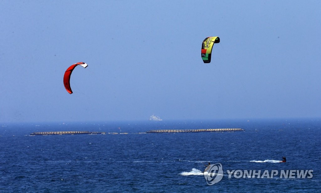 | ▲ 더위 날려버리자 (강릉=연합뉴스) 이종건 기자 = 초여름 날씨를 보인 6일 강릉 송정해변을 찾은 카이트보드 동호인들이 바다 위를 질주하며 휴일을 즐기고 있다. 2021.6.6 momo@yna.co.kr |