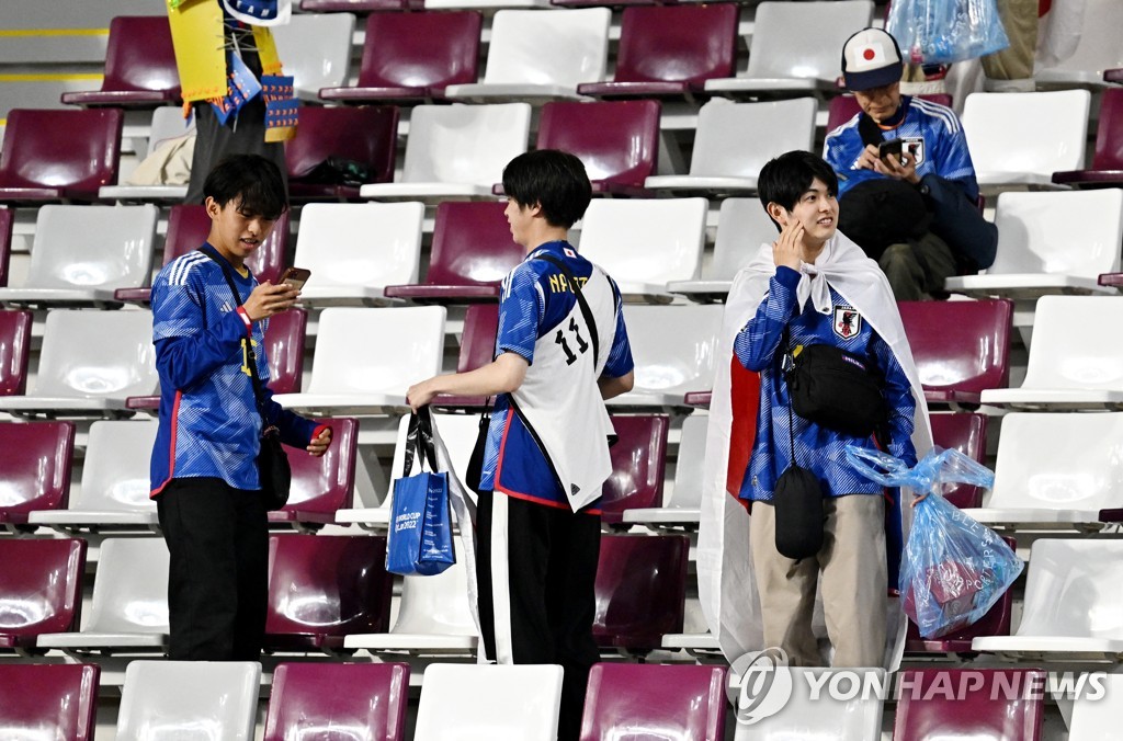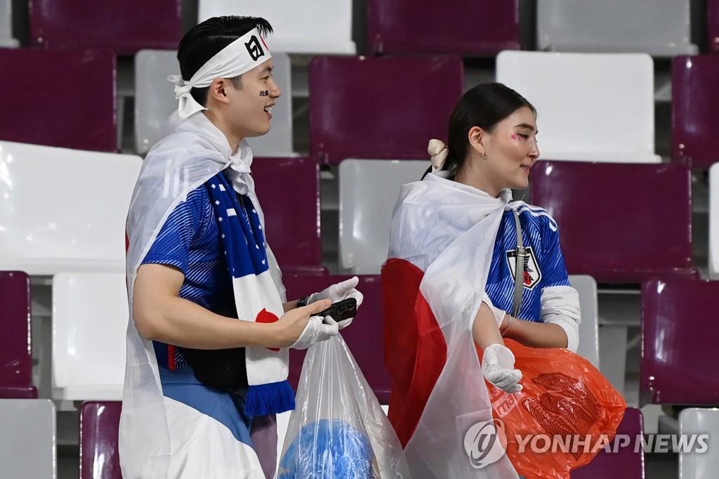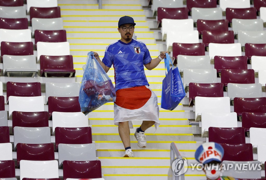 AFP, 로이터통신 등이 타전한 사진을 보면 일부 일본 팬들은 양손에 봉투를 들고 관중석을 돌아다니며 쓰레기를 줍는다.