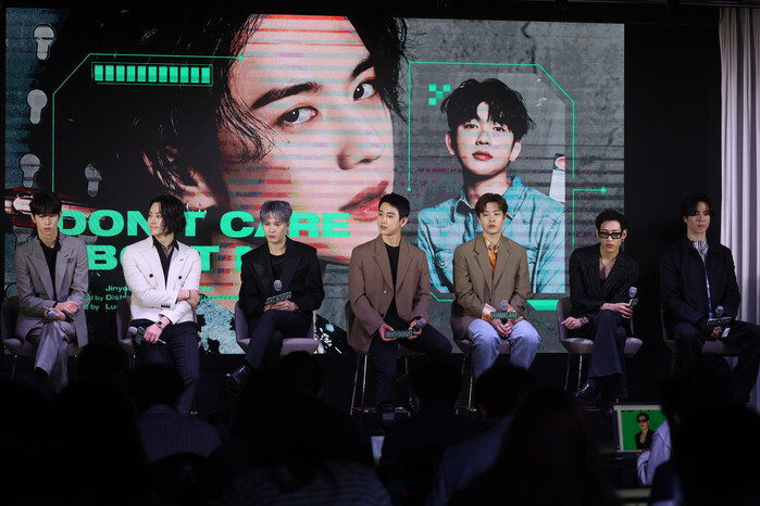 South Korean boy group GOT7 answers reporters' questions during a news conference on its new mini album "GOT7" at a Seoul hotel on May 23, 2022. (Yonhap)
