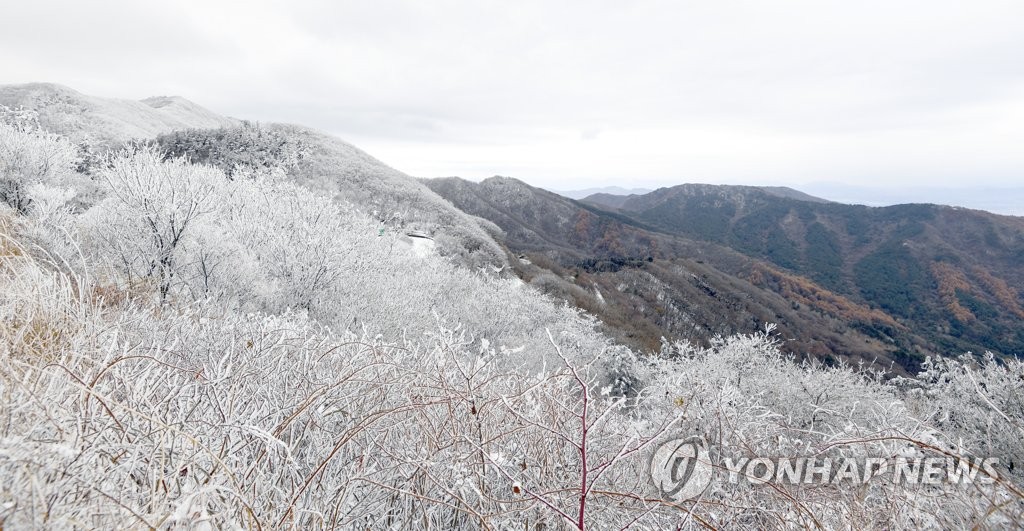 (남원=연합뉴스) 11일 전북 남원의 지리산 정령치에 내린 눈과 상고대가 멀리 산 아래 단풍과 어우러져 한 폭의 수채화를 그려내고 있다.