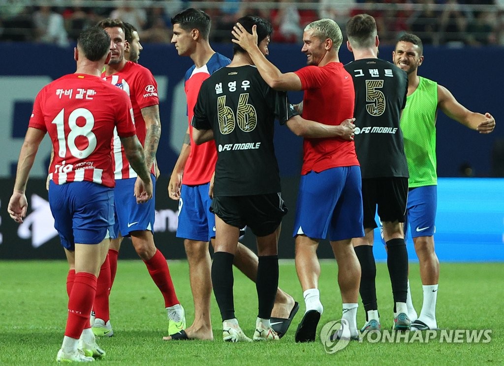 | ▲ 밝게 인사하는 그리에즈만-설영우 (서울=연합뉴스) 김도훈 기자 = 27일 서울월드컵경기장에서 열린 쿠팡플레이 시리즈 1차전 팀 K리그와 아틀레티코 마드리드(AT마드리드)의 경기가 끝난 뒤 설영우와 그리에즈만이 인사하고 있다. 2023.7.27 superdoo82@yna.co.kr |