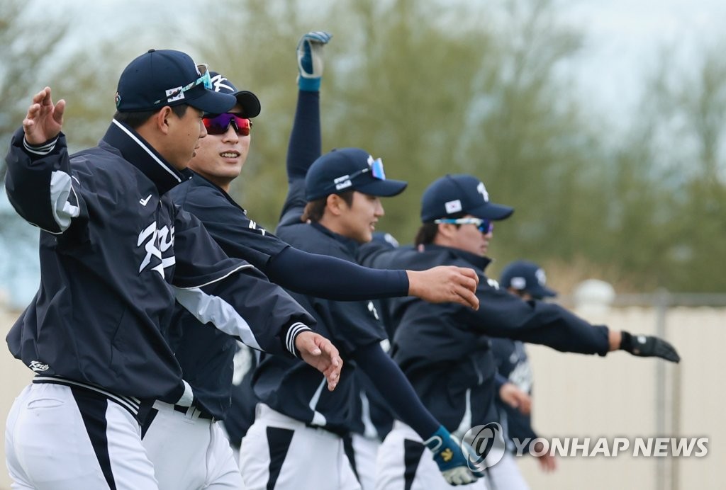 | ▲ 소통하며, 몸도 풀며 2월 20일(현지시간) 미국 애리조나주 투손 키노스포츠 콤플렉스에서 열린 월드베이스볼클래식(WBC) 2023 대한민국 대표팀 훈련. 대표팀 이정후와 정우영이 훈련을 시작하며 스트레칭을 하던 중 대화하고 있다. [연합뉴스 자료사진] |