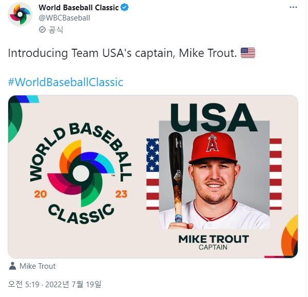 | ▲ WBC 미국대표팀 주장 마이크 트라우트 [WBC 공식 트위터 계정. 캡처. 재판매 및 DB 금지] |