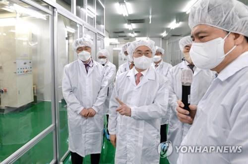 | ▲ Industry Minister Moon Sung-wook (C) visits a factory of Youlchon Chemical Co. in the city of Ansan, Gyeonggi Province, on Feb. 28, 2022, which is carrying out a joint project with the government on batteries for electric vehicles, in this photo provided by his office. (PHOTO NOT FOR SALE) (Yonhap) |