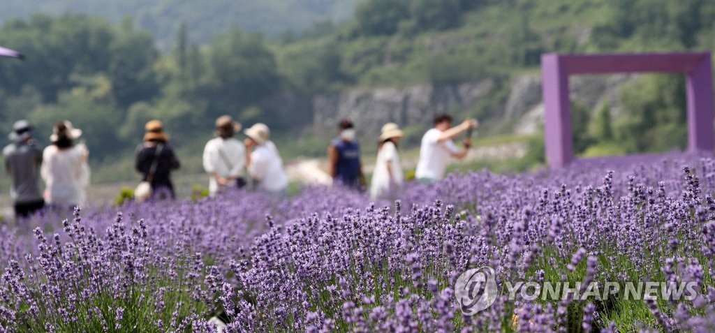 | ▲ 보랏빛 세상으로 변한 동해 무릉별유천지 (동해=연합뉴스) 유형재 기자 = 19일 강원 동해시 무릉별유천지 내 2만㎡에 보랏빛 라벤더꽃이 활짝 펴 관광객들이 사진을 찍으며 즐거운 휴일을 보내고 있다. 2022.6.19 yoo21@yna.co.kr |