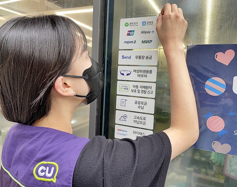 | ▲ A CU store employee posts a notice of various accepted international payment methods, in this photo provided by BGF Retail Co. on May 31, 2022. (PHOTO NOT FOR SALE) (Yonhap) |