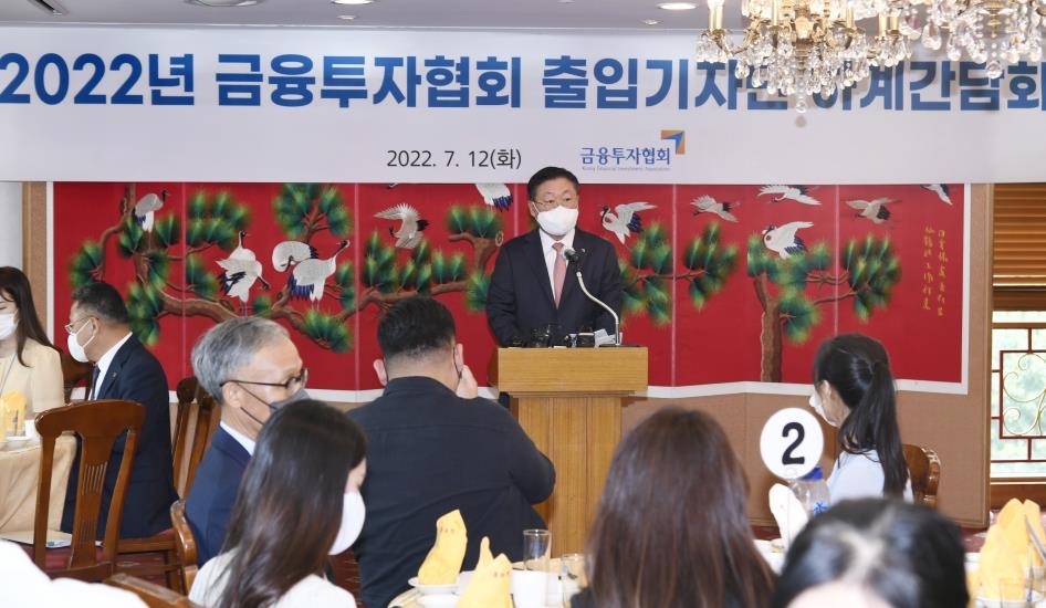 | ▲ Korea Financial Investment Association Chairman Na Jae-cheol (C) speaks during a press conference in Seoul on July 12, 2022, in this photo provided by the financial organization. (PHOTO NOT FOR SALE) (Yonhap) |