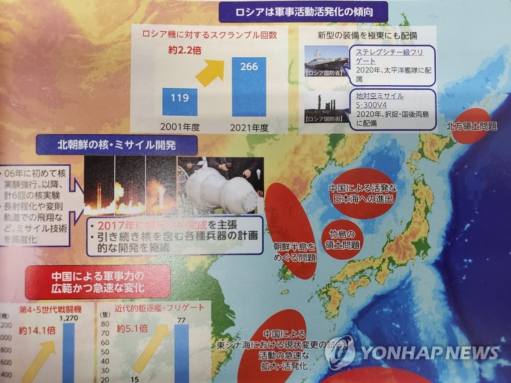 | ▲ 일본 방위백서에 '다케시마 영토 문제' 표기 (도쿄=연합뉴스) 김호준 특파원 = 일본 방위성이 22일 발표한 2022년 판 방위백서에 게재된 '우리나라 주변의 안전보장 환경'이라는 제목의 지도상 독도 위치에 '다케시마(竹島·일본이 주장하는 독도의 명칭) 영토 문제'라고 표기돼 있다. 2022.7.22 hojun@yna.co.kr |