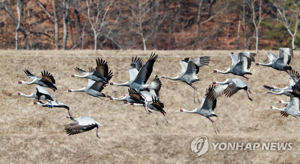 (의령=연합뉴스) 김동민 기자 = 경남 의령군은 국제 멸종위기종인 재두루미가 정곡면 '부자(富者) 마을'에서 월동하는 모습이 포착됐다고 5일 밝혔다.