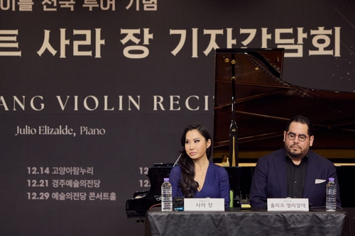 | ▲ 바이올리니스트 사라 장(왼쪽)과 피아니스트 훌리오 엘리잘데가 9일 서울시 서초구 코스모스아트홀에서 열린 기자간담회에 참석하고 있다. [공연기획사 크레디아 제공. 재판매 및 DB 금지] |