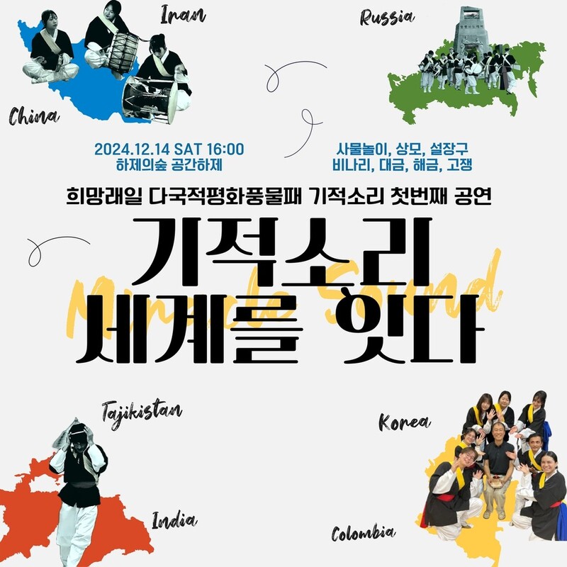 (서울=연합뉴스) 김지선 기자 = 사단법인 희망래일(이사장 이동섭)은 다국적 청년들로 구성된 평화풍물패 '기적소리'가 오는 14일 서울시 중구 공간하제에서 첫 정기 공연을 한다고 5일 밝혔다.