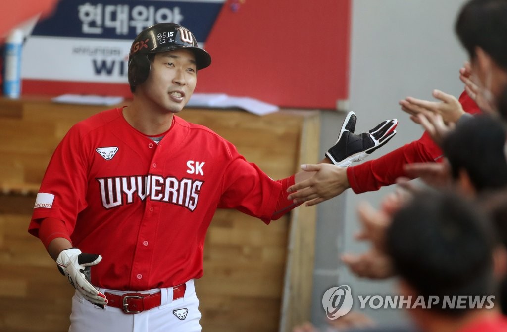 | ▲ In this file photo from Oct. 11, 2020, Ko Jong-wook of the SK Wyverns is greeted by his teammates in the dugout after scoring a run against the Kia Tigers in a Korea Baseball Organization regular season game at Gwangju-Kia Champions Field in Gwangju, 330 kilometers south of Seoul. (Yonhap) |