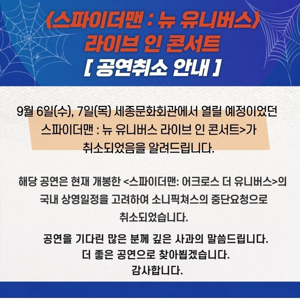 공연기획사 마스트미디어는 9월 6∼7일 세종문화회관 대극장에서 개최 예정이었던 '스파이더맨: 뉴 유니버스 라이브 인 콘서트' 공연을 취소한다고 공식 소셜미디어(SNS)를 통해 17일 공지했다.