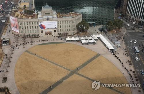 | ▲ People line up to receive COVID-19 tests at a temporary testing station in front of Seoul City Hall in central Seoul on Feb. 28, 2022. (Yonhap) |