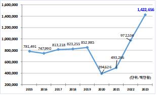 이는 2022년 기록한 약 9천725억원보다 4억502억원(46.3%) 증가한 수치다. 코로나19 팬데믹 이전인 2019년(약 8천529억원)과 비교해도 66.8% 증가했다. 공연시장 전체 매출액은 2020년 약 3천946억원, 2021년 약 4천932억원을 기록했다.