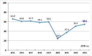 공연장 활성화 정도를 확인할 수 있는 공연장 가동률은 2020년 이후 3년 연속 증가했다. 2020년 24.5%에 불과했던 공연장 가동률은 2021년 37.2%, 2022년 50.2%에 이어 지난해에는 54.5%를 기록했다.