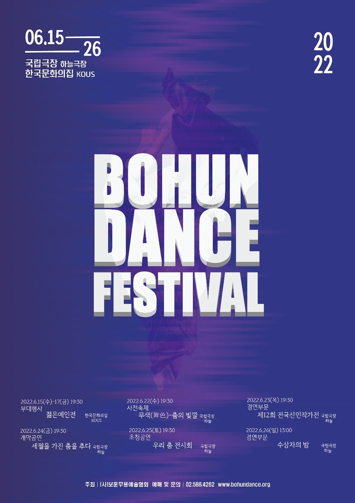 앞서 22일에는 중견무용가들이 펼치는 '무색(舞色)-춤의 빛깔' 공연도 마련돼 있다. 25일 초청공연 '2022 우리 춤 전시회'에는 한예종 전통예술원 등 여러 대학과 기관 소속 무용단의 무대가 꾸며진다.