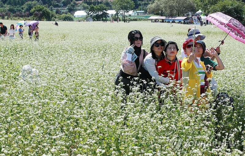 | ▲ 봉평 메밀꽃밭에서 찰칵 (평창=연합뉴스) 이재현 기자 = 2023평창효석문화제 사흘째인 10일 소금을 뿌린 듯한 메밀꽃밭 포토존에서 방문객들이 가을 정취를 만끽하고 있다. 효석문화제는 오는 17일까지 봉평면 이효석문화마을 일원에서 열린다. 2023.9.10 jlee@yna.co.kr |